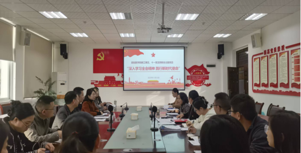 教工第五、十一党支部在四楼 1-411 会议室联合开展 “深入学习全会精神 践行新时代使命” 主题党日活动。学校党委书记刘文、学院党委书记罗军敏出席活动,两个党支部全体党员参加,活动由教工第五党支部书记秦娜琳主持。