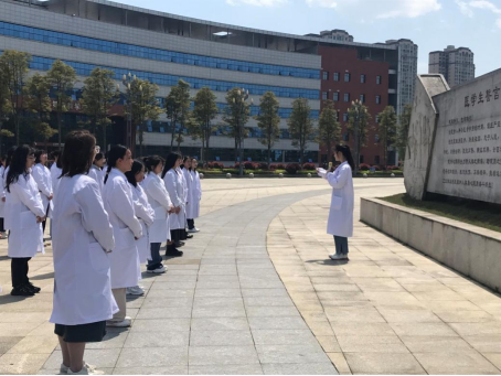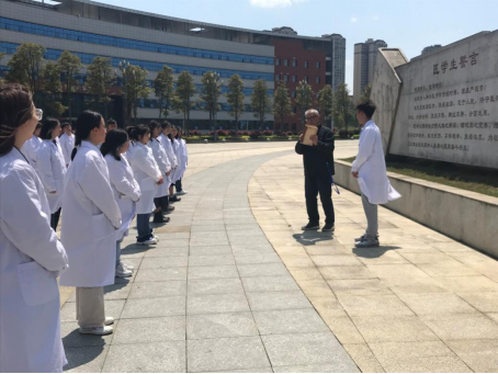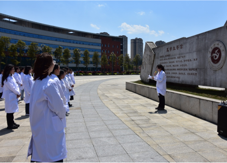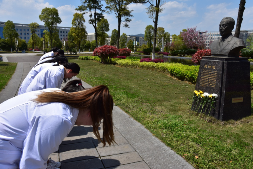 活动当天,学生们身着整齐的白大衣,在医学生誓言石碑下做出庄严承诺;薛黔教授为现场师生讲述解剖学与人类学家吴汝康院士心系祖国和人民,放弃在美国优渥的物质条件,回国建设新中国的感人事迹,引导学生饮水思源,铭记老一辈遵医人爱国、奋斗、奉献的精神。学生代表回顾了以陈荣殿教授、沈其震院士等为代表的遵医先贤为学校建设和发展殚精竭虑、呕心沥血的事迹,表达了为祖国医疗卫生事业发展奉献青春的坚定决心。活动最后,学院师生来到科研楼和第四教学楼前的遵医先贤铜像处集体缅怀、鞠躬默哀、敬献鲜花。