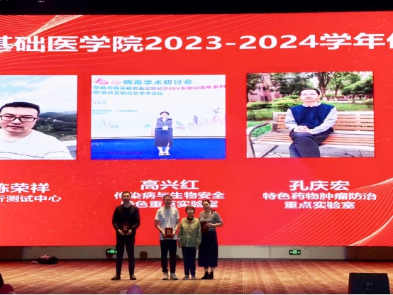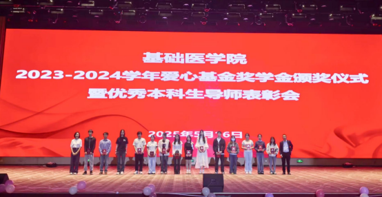 晚会序幕由庄重的表彰仪式拉开。学院2023-2024学年“爱心基金”奖学金授予熊明霞等11名同学学业进步奖、张淳与龚诗琴2名热心公益奖、车晴娅、李坤乾、范忠玉3位科研新星,共16名学子登上荣誉殿堂。陈荣祥、高兴红、孔庆宏、檀军、赵娟娟5位优秀本科生导师接过荣誉证书,他们以匠心育人的身影,成为晚会第一道璀璨星光。