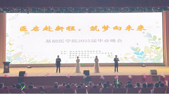 朗诵节目《毕业季的骊歌》将晚会氛围推向高潮。基础医学2025届同学们用真挚的情感、深情的诵读,勾起了大家对校园生活的美好回忆。歌曲串烧《回忆里的旋律》瞬间将大家带回到那些温暖美好的校园时光。走进《关山月》的世界,当琴韵与舞步交融,一幅雄浑壮阔的历史长卷在眼前展开。当《月半小夜曲》的最后一个音符消散在月光中,大屏幕亮起“医启赴新程,筑梦向未来”的寄语,为晚会画下温暖句点。