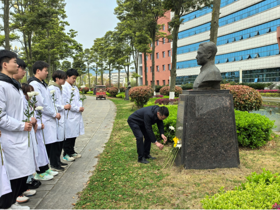 最后,师生们手捧鲜花,分别前往第四教学楼和科研楼前的先贤雕塑献花,并深深鞠躬,表达对先贤的缅怀与敬意。每一尊雕塑都承载着一段厚重的历史,每一次献花都是一次精神的传承,让师生们近距离感受着先贤们的精神力量,心中的责任感和使命感愈发强烈。