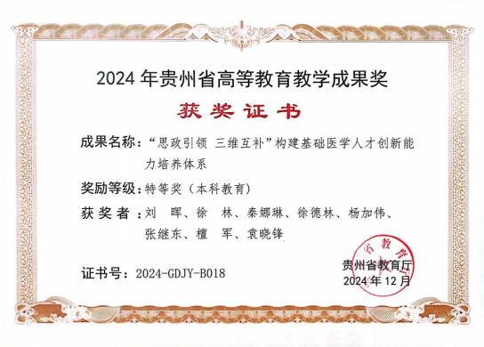 《“思政引领 三维互补”构建基础医学人才创新能力培养体系》项目,荣获省级教学成果最高荣誉——特等奖。