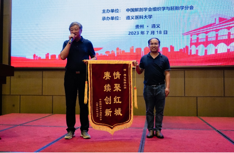 7月18日晚进行了本次会议的闭幕式,在闭幕式中进行了优秀论文报告奖、优秀墙报、首届“形态与艺术”组胚显微摄影图片展优秀作品、首届“组织学与胚胎学教学模型设计”大赛优秀作品、第四届“蒙博润助学金”的颁发。其中,檀军博士获得优秀论文报告奖、研究生代小方获得优秀墙报奖、本科生贺佳琪团队获得教学模型设计大赛二等奖、研究生陈姗姗获得蒙博润助学金。闭幕式最后,周德山主任委员代表中国解剖学会组胚分会向我校为本次会议顺利召开所做的精心组织和安排表示感谢,赠送题为“情聚红城、赓续创新”的锦旗。