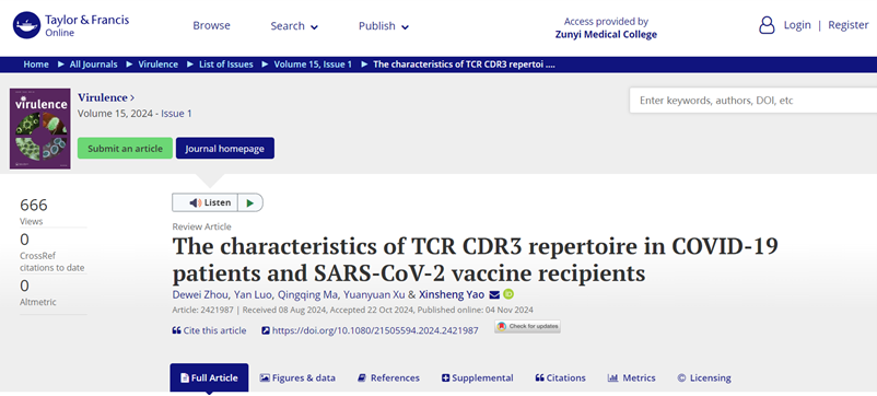 姚新生教授团队在国际著名期刊《Virulence》(中科院1区/Top期刊)发表了题为“The characteristics of TCR CDR3 repertoire in COVID-19 patients and SARS-CoV-2 vaccine recipients”的综述。免疫学研究生2020级周得维,2022级罗彦,附属航天医院马庆庆为共同第一作者,姚新生教授为通信作者。
