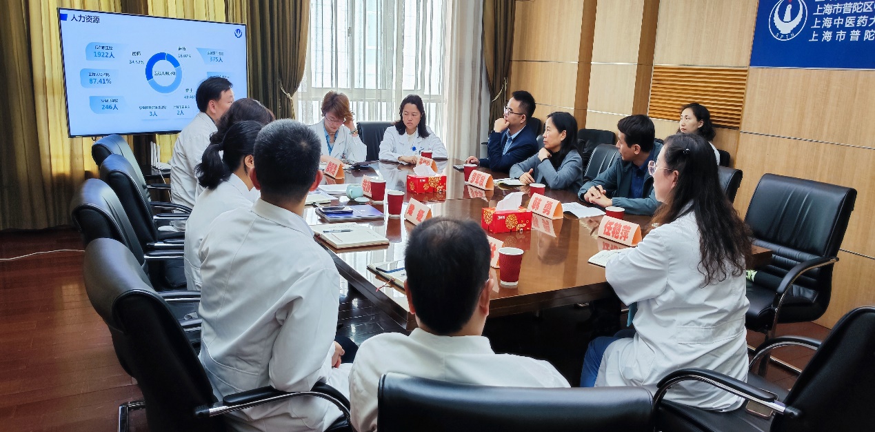 党委书记罗军敏教授带队,副院长韩勇、科技与研究生科科长于红松、组织胚胎学教研室副主任任艳萍一行四人赴上海中医药大学附属普陀区中心医院调研交流。上海中医药大学附属普陀区中心医院党委书记陆静静、党委副书记梁娅、副院长徐林(挂职)、副院长殷佩浩、实验中心主任张鹏等陪同调研。交流会由徐林主持。