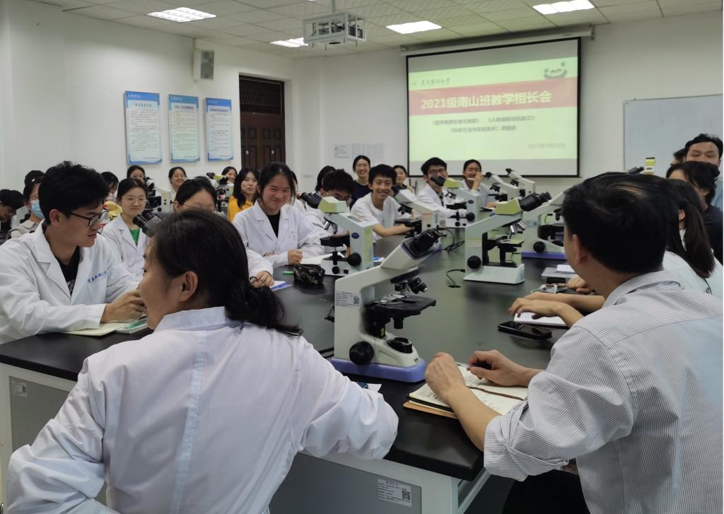 于2023年4月19日晚召开2021级南山班《医学病原生物与免疫学》《人体结构与机能Ⅱ》《科研方法与实验技术》三门整合课程的教学相长会。2021级南山班全体同学和承担三门整合课程的免疫学、微生物学、寄生虫学、病理生理学、医学仪器分析教研室主任及部分课程教师参加了本次会议。