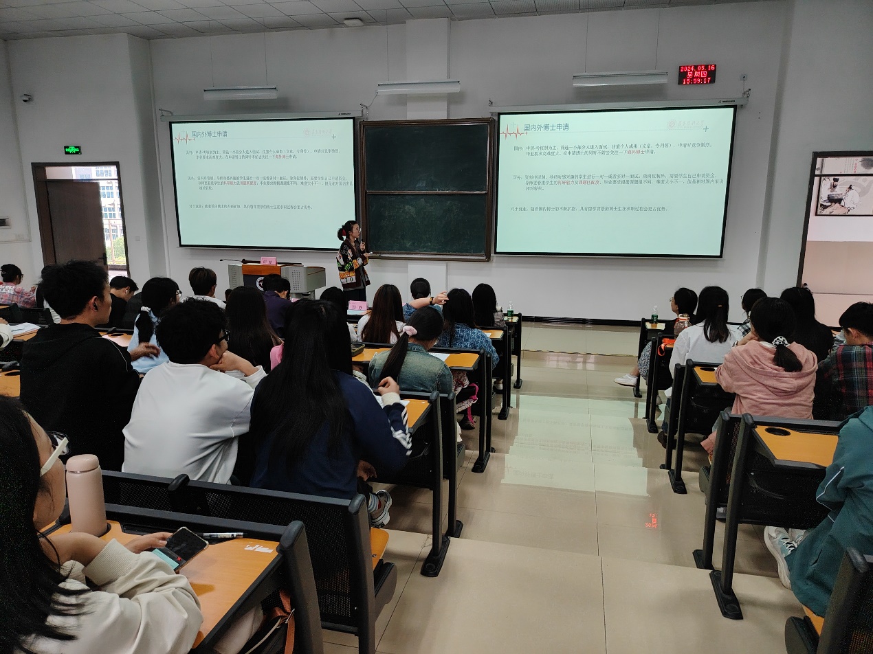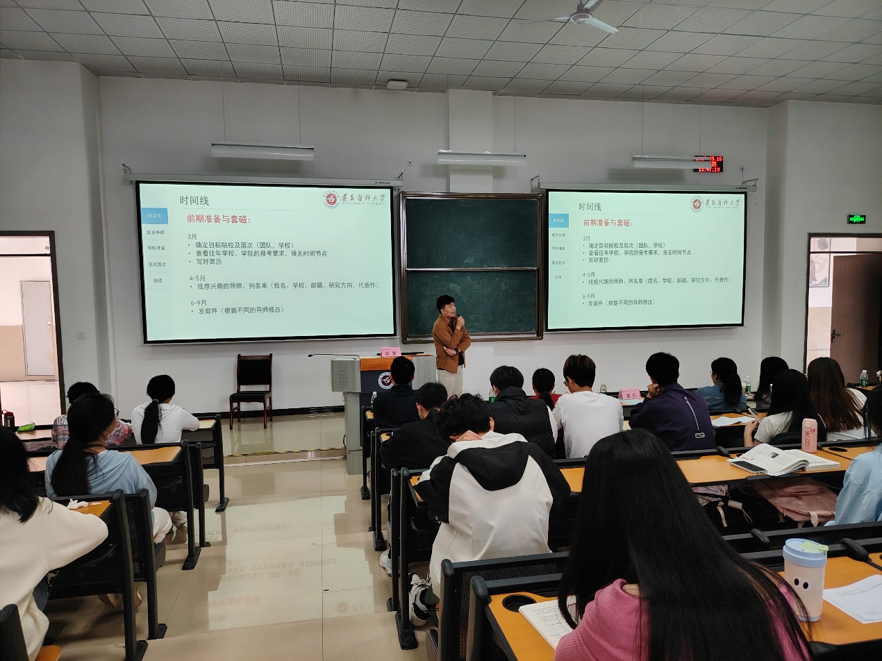 随后,由2021级研究生李肇高同学和张玉书同学分别进行了国内、国外申博经验分享。两位同学结合自身经历,对国内外博士申请时间线、相关制度资料的查询和了解的必要性、自身材料准备以及面试准备等各个方面进行了介绍,让同学们对国内外申博的整个流程有了更清晰地认识,增强了同学们继续读博深造的信念与信心。