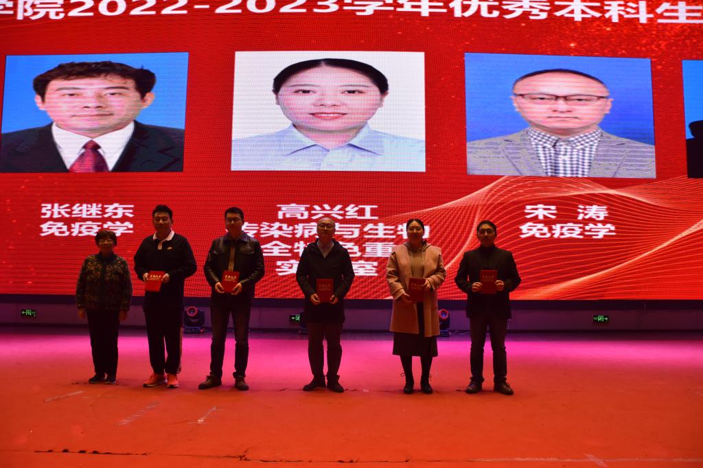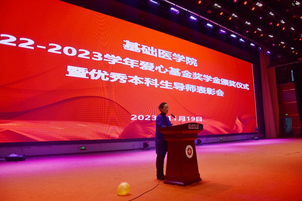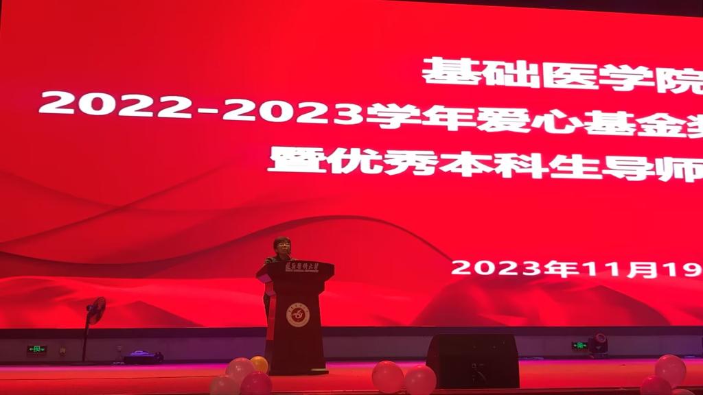 在2022-2023学年“爱心基金”奖学金颁奖仪式暨优秀本科生导师表彰会上,对获得一等奖的车晴娅、朱学睿、谢佳蓉、牟兰兰4名、二等奖的李怡玲等9名、三等奖的罗婷婷等9名、进步奖的刘晓燕、黄廷莉、李豪3名共计25名优秀学生和徐德林、张继东、高兴红、宋涛、肖毅5位本科专业优秀导师进行了表彰。学校关心下一代工作委员会钱民章教授对师生寄语时说到,医学的发展离不开基础医学研究,鼓励同学们要耐得住寂寞、沉得下心,学院设立“爱心基金”奖学金也是在不断鼓励同学们能够取得更多成绩,基础医学各位教师的辛勤付出也为同学们提供了积极支撑。